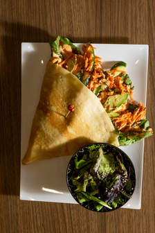 Krab combined with spicy mayo, creamy avocado slices, crisp cucumber slices, crunchy romaine lettuce, lightly pickled carrot slaw with sesame seeds, and a drizzle of spicy sriracha, folded in a tender crépe.