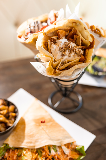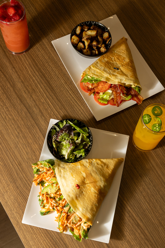 Slow-cooked brisket and creamy queso, pickled jalapeno, wrapped in a warm crépe and served with w/ crushed Takis, cilantro and onion straws.