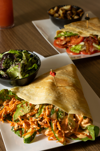 Crispy bacon strips, crisp romaine lettuce leaves, fresh Roma tomato slices, creamy avocado slices, and smooth mayo, folded together in a warm buttery crépe.