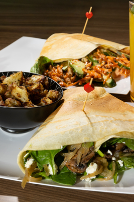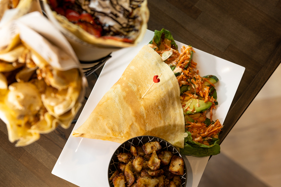 Fluffy scrambled eggs, savory sausage, roasted hatch green chile, roasted potatoes, and melted cheddar cheese wrapped in a warm buttery crépe for a bold, Southwest-inspired breakfast favorite.