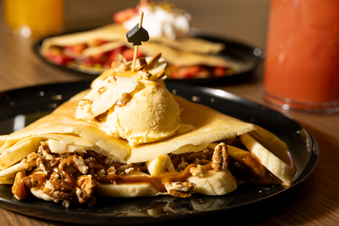 Fresh banana slices, warm dulce de leche sauce, crunch toasted pecans, and a dusting of powdered sugar, folded in a golden crépe.